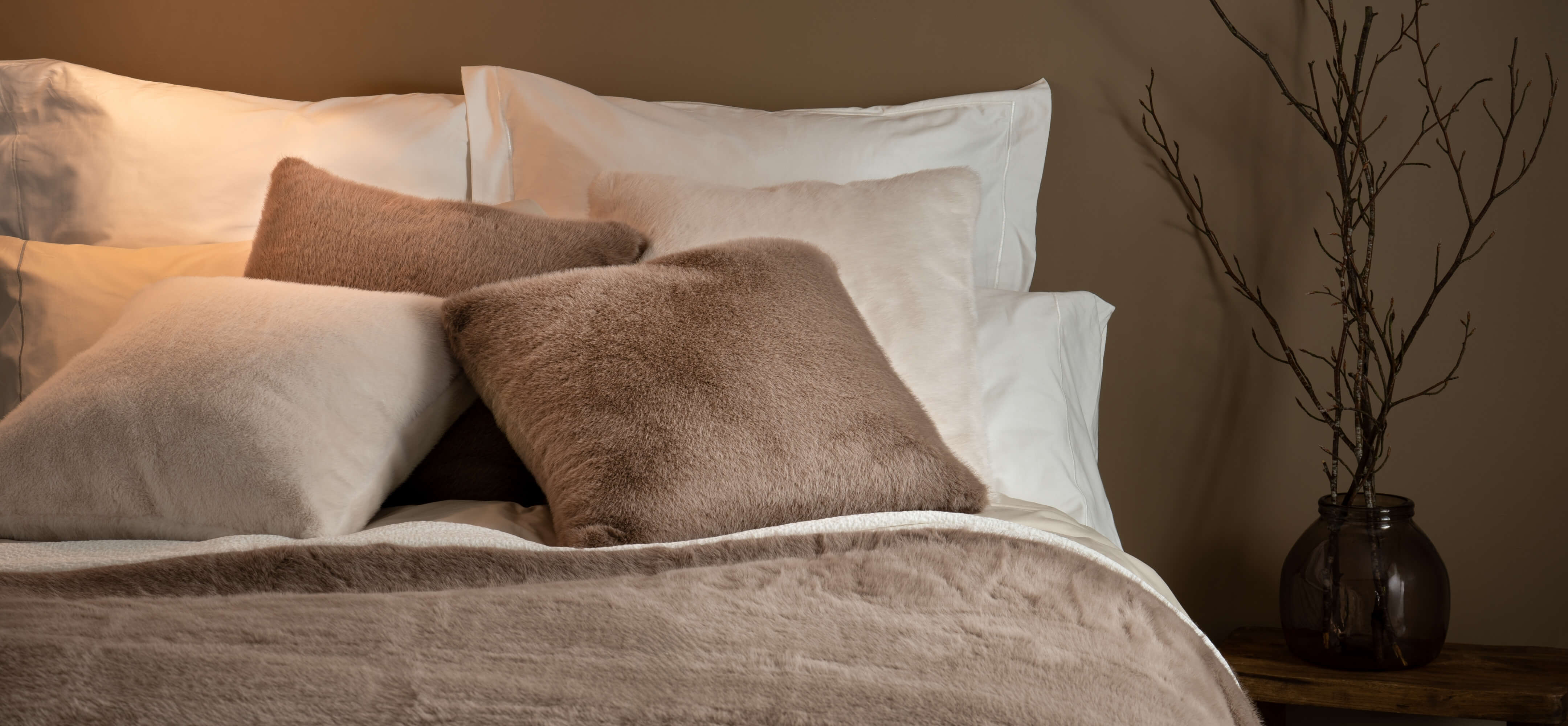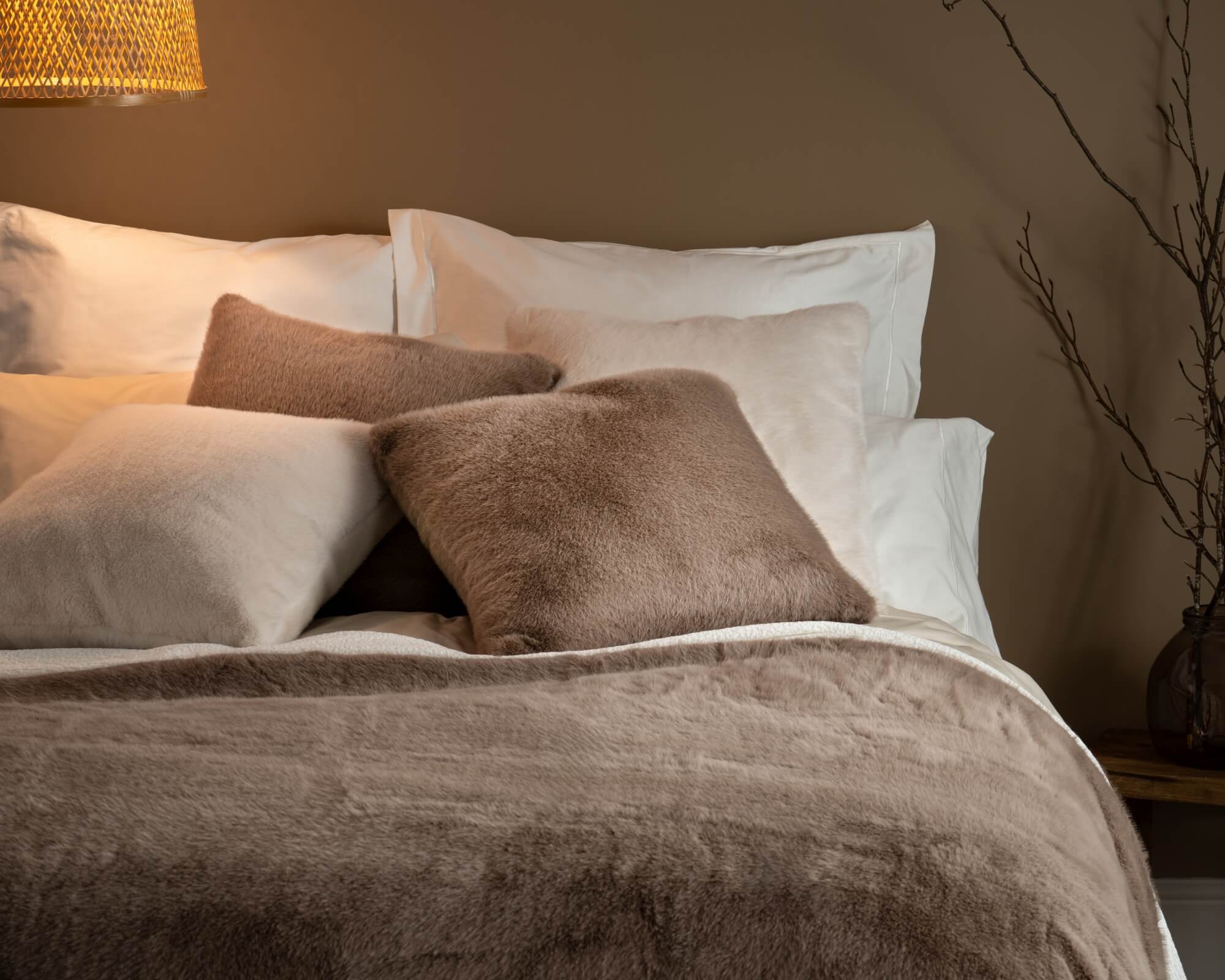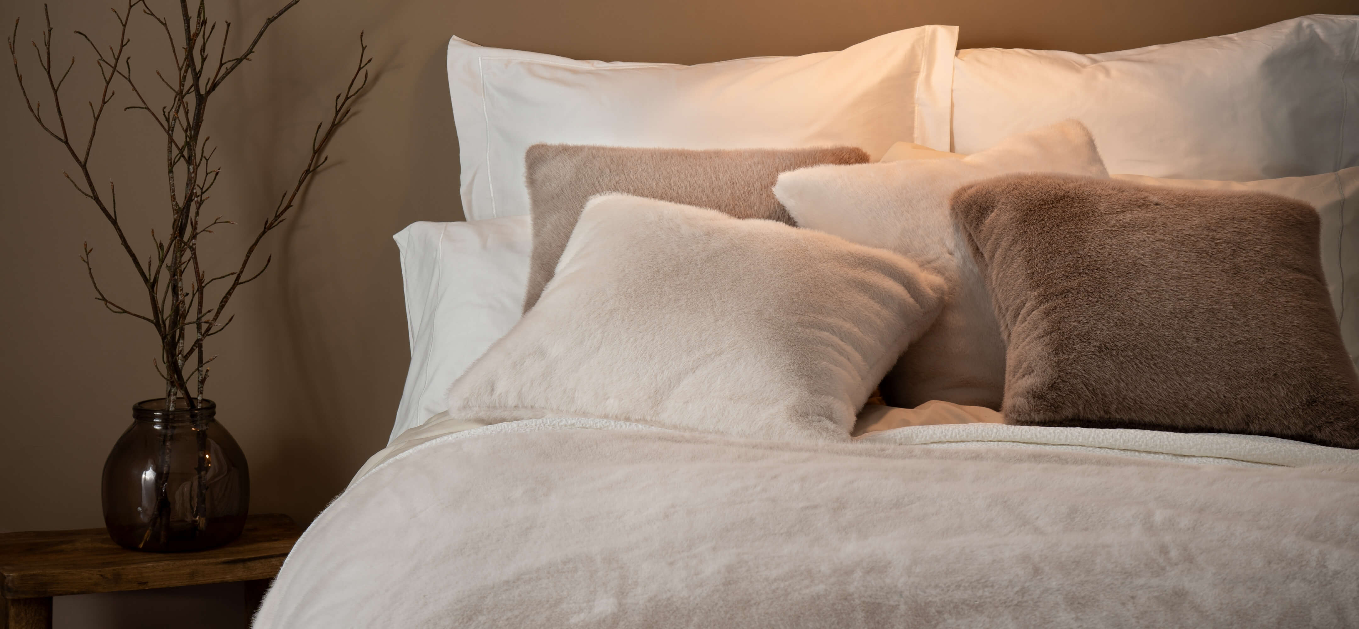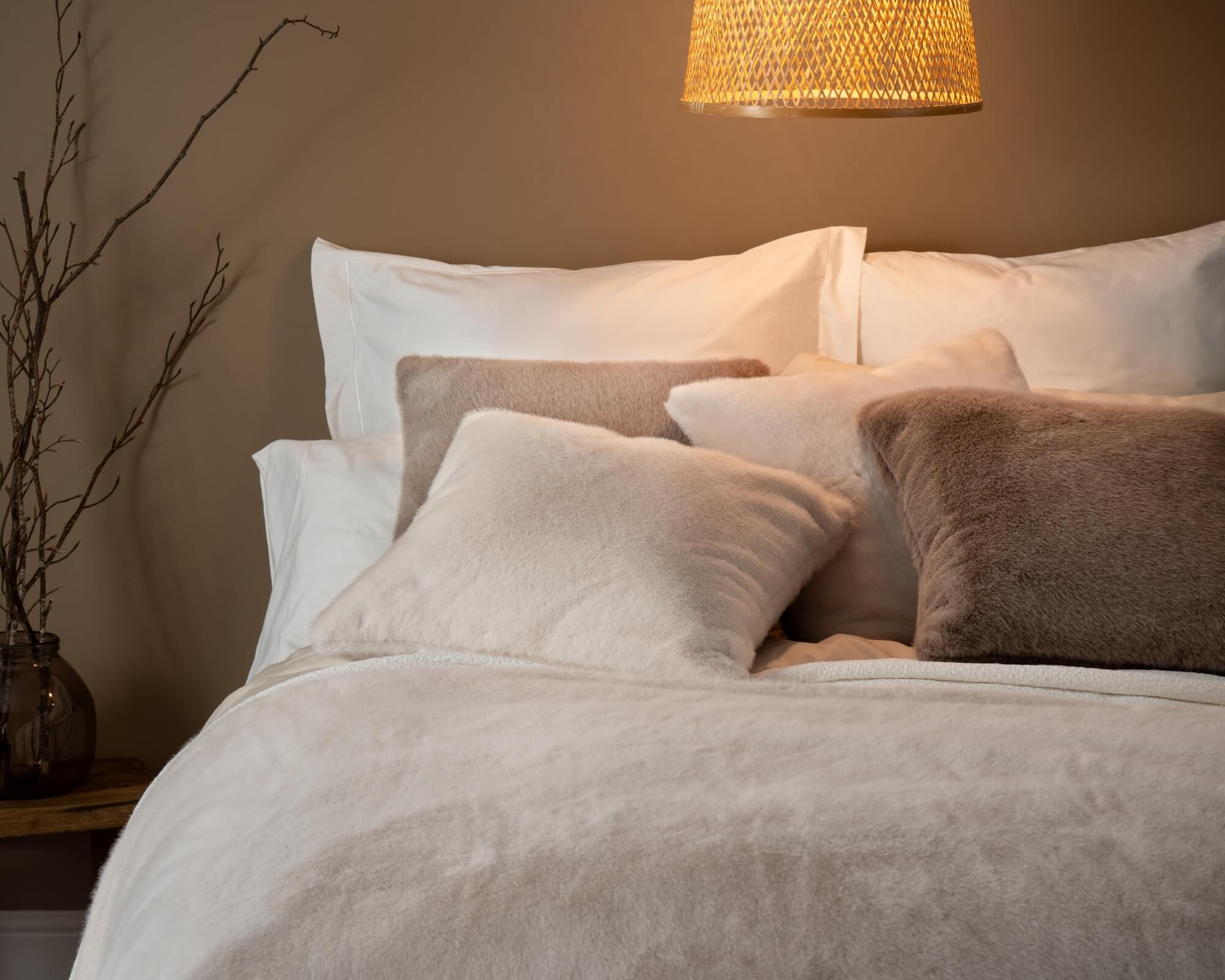 These incredibly soft and cosy faux fur throw and cushions exude warmth and wintery charm.