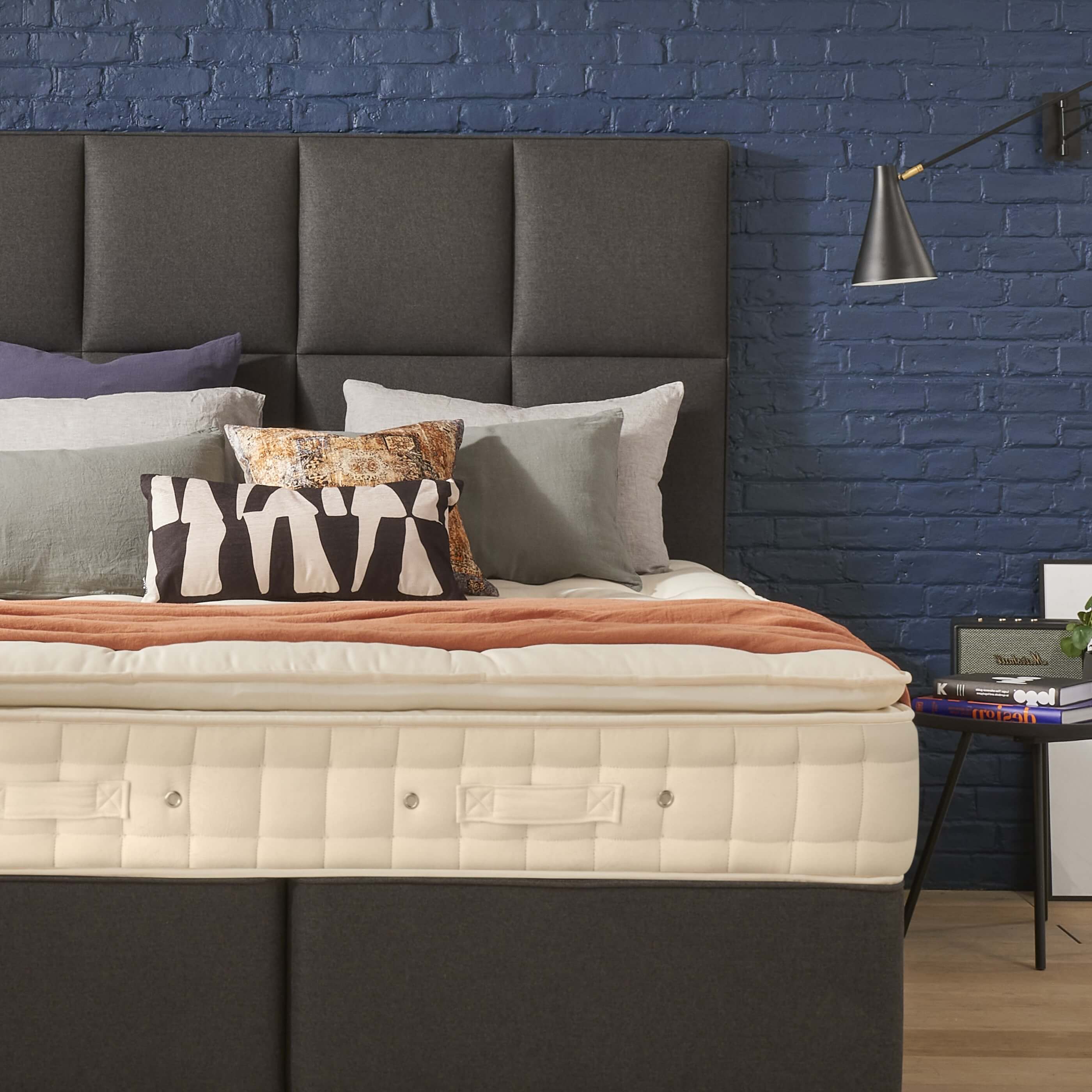 This mattress is full of carefully selected fillings. The mattress base is crafted with a supportive upper layer of Himalayan allo, Kapok and cotton, and a lower layer of eOlus recycled fibre for additional durability. The indulgently soft pillowtop contains a British wool blend for additional breathable comfort and support.
